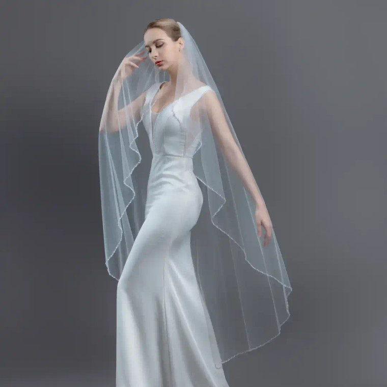 This beautiful one layer waltz wedding veil features angel cut styling to beautifully frame your torso. The sparkling beaded edge features crystal bicone beads, baby pearls and seed beads. Just the right amount of sparkle to complement your wedding gown!
